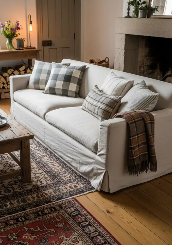 The most magnificently beautiful linen slipcover sofa farmhouse living rooms are those where the slipcover linen is of genuinely excellent natural quality — undyed natural linen in warm oatmeal with beautiful visible weave texture. Loose-fitting covers creating beautiful casual draping at the seat base. Feather and down cushions beneath providing maximum comfort. A warm plaid throw casually draped over one arm. Layered ticking stripe, plaid, and simple linen cushions. A reclaimed wood coffee table below. Layered vintage rugs. Warm wide plank floors. Stone fireplace beyond. The linen slipcover sofa creates extraordinary farmhouse casual elegance.