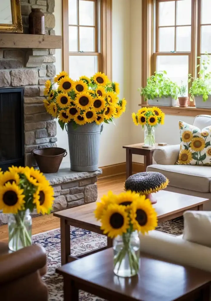 Fresh sunflowers throughout a farmhouse living room create the most gloriously joyful and the most completely golden botanical atmosphere available in any gathering space — the specific quality of their large warm yellow blooms, their honest unpretentious character, and their completely unmistakable association with genuine agricultural summer abundance creating a living room of such extraordinary sunshine warmth and such genuinely happy botanical energy that every person who enters immediately smiles more broadly, feels more warmly welcomed, and experiences a completely authentic moment of genuine botanical delight!