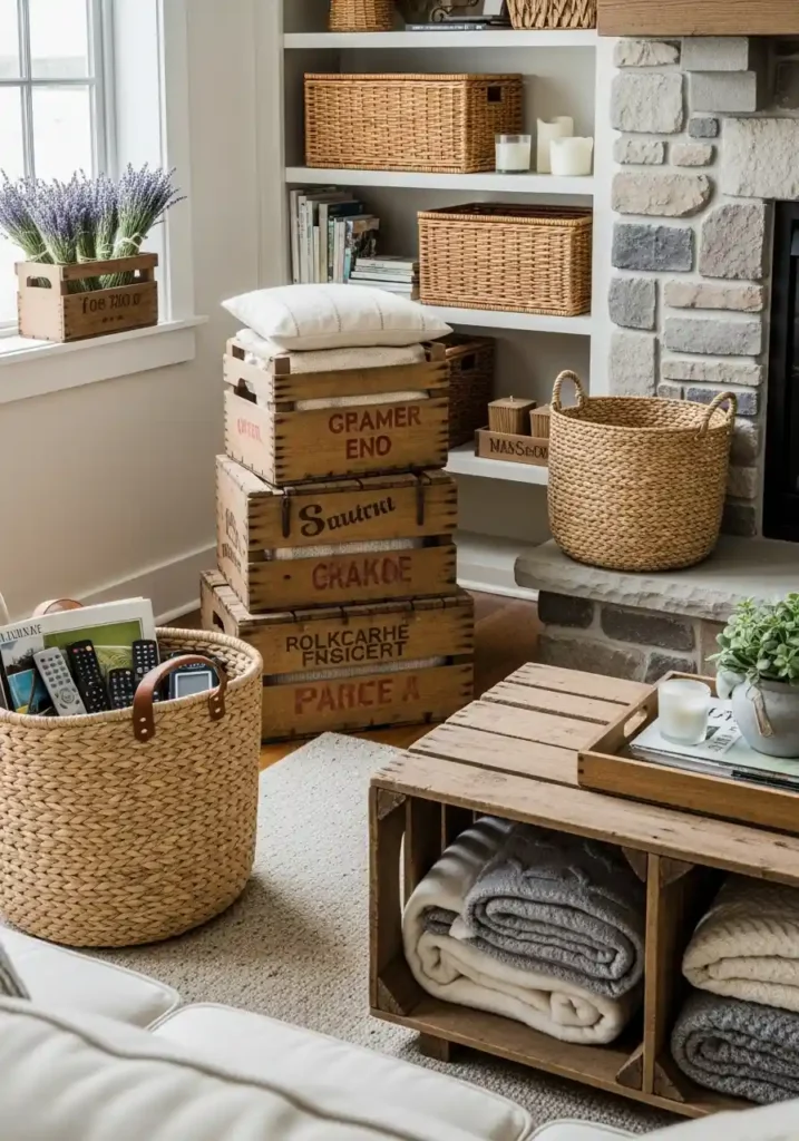 Vintage wooden crates and natural woven baskets used as organizational storage throughout a farmhouse living room create the single most ingeniously practical and the most genuinely characterful storage solution available — because genuine vintage apple crates, seagrass baskets with leather handles, and graduated wicker baskets simultaneously provide real, significant storage capacity for the accumulated blankets, remote controls, books, and household items that gathering spaces inevitably require while adding the most authentic and the most warmly beautiful rustic material character available at minimum cost and maximum farmhouse aesthetic authenticity!