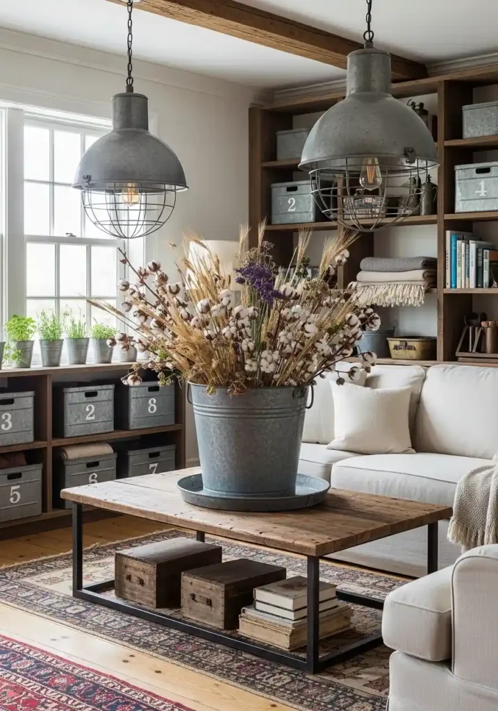 The most magnificently authentic galvanized metal and wood farmhouse living rooms are those where the metal elements are genuinely varied and genuinely functional in origin — an actual large galvanized bucket repurposed as a dramatic flower vase. Industrial cage pendant lights with genuine galvanized finish. Numbered galvanized storage bins providing both organizational function and authentic visual character. Small galvanized herb planters on the window ledge. Reclaimed wood shelving and beam accents. Cream linen sofa. Warm plank floors. Vintage rugs. Each authentic galvanized and reclaimed wood element creates extraordinary agricultural rustic farmhouse charm.