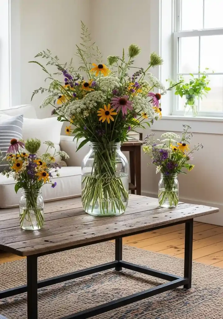 Fresh wildflowers arranged in genuine Ball Mason jars throughout a farmhouse living room create the single most authentically charming and the most genuinely joyful botanical decoration available — each abundant arrangement of gathered wildflowers including black-eyed Susans, Queen Anne’s lace, coneflowers, and wild grasses communicating a specific, beautiful farmhouse truth: that the most abundant botanical beauty available is found not in expensive florist arrangements but in the generous, unpretentious wildness of real fields, real gardens, and real seasonal botanical life gathered with genuine love and arranged with complete, honest simplicity!