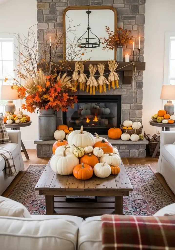 A farmhouse living room styled for the autumn harvest season — where abundant heirloom pumpkins in cream, white, and warm orange, dried wheat stems, autumn branches with brilliant foliage, and warm plaid textiles combine in a celebration of the most beautiful and the most authentically agricultural time of year — creates the most genuinely seasonal and the most completely connected-to-the-land gathering space available, because a farmhouse living room that celebrates autumn harvest with real pumpkins from a real garden or farmers’ market genuinely inhabits the seasonal moment with complete, honest, and beautifully enthusiastic agricultural authenticity!