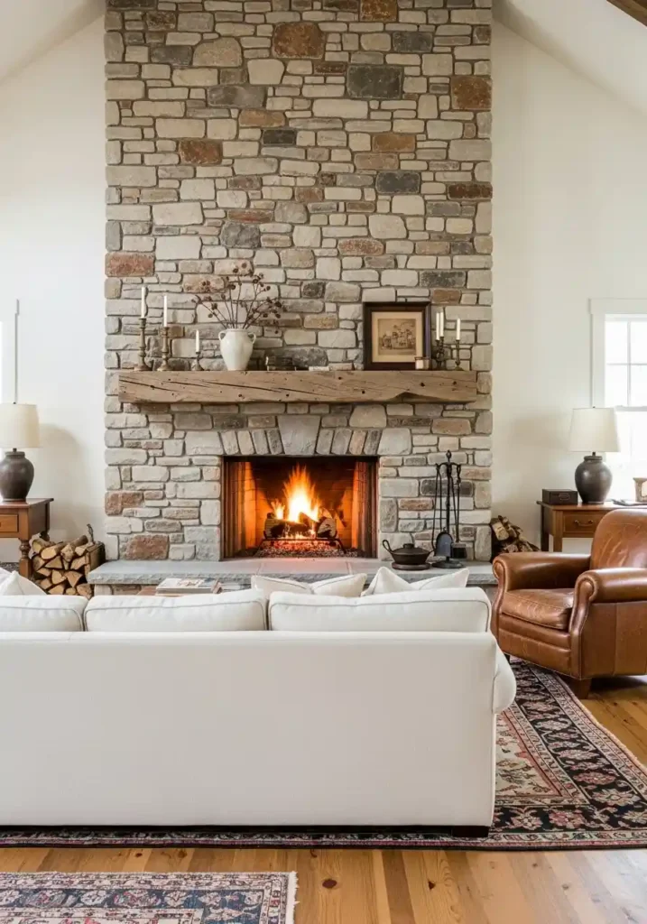 3. The Stone Fireplace Living Room: The Ancient Warmth That Anchors Every Farmhouse