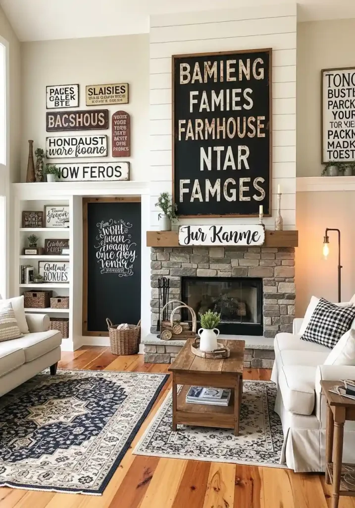 9. The Vintage Sign and Typography Living Room: Words That Give the Farmhouse Its Personality