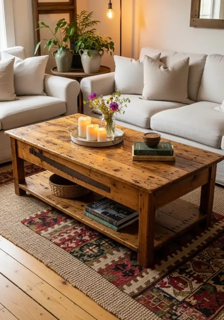 4. The Vintage Wooden Coffee Table: Reclaimed Beauty at the Gathering Center