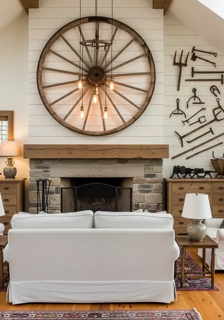 11. The Wagon Wheel and Rustic Metalwork Living Room: Heritage Objects as Central Art