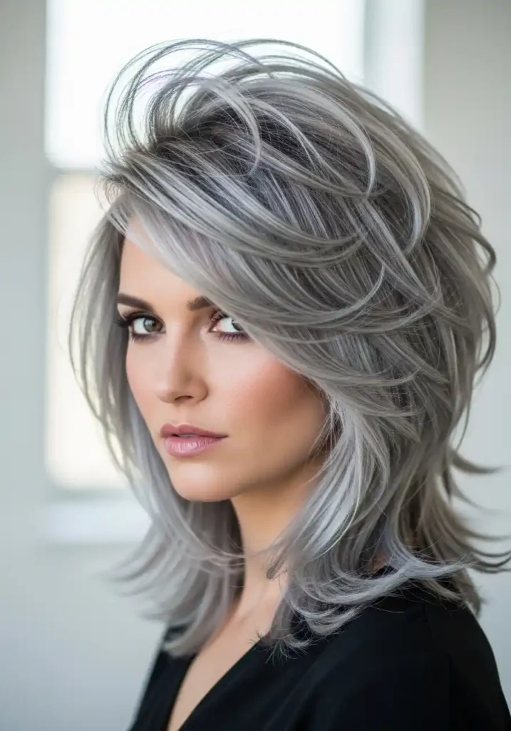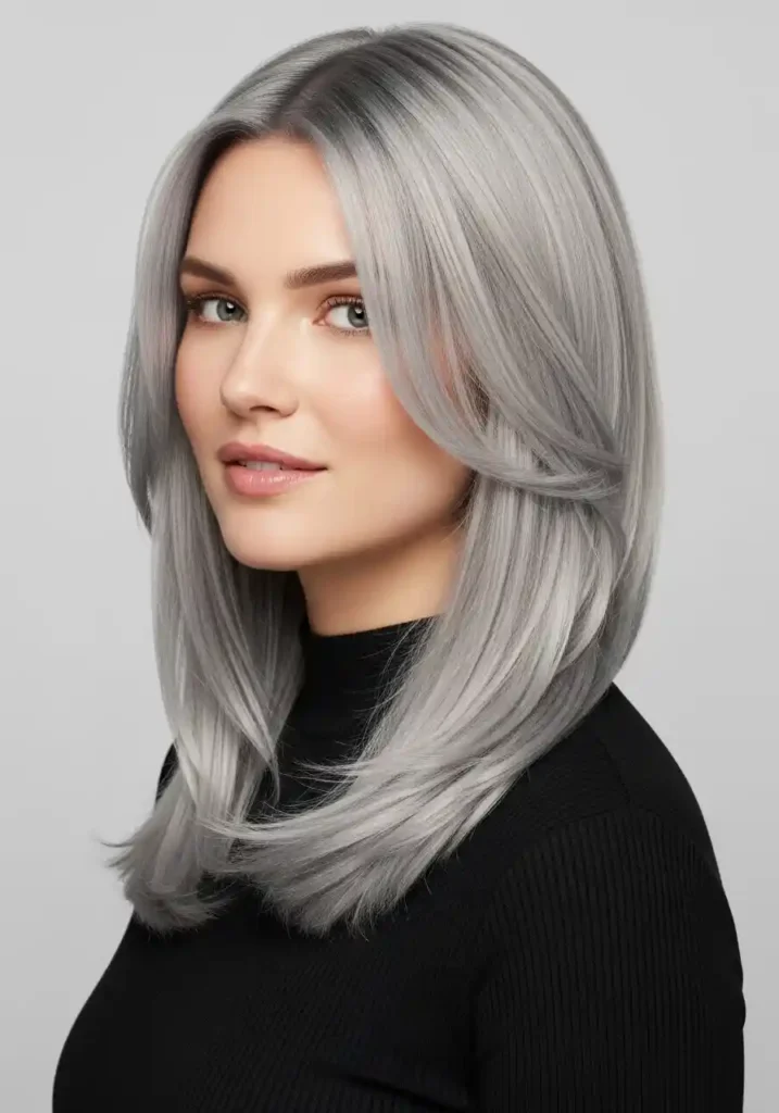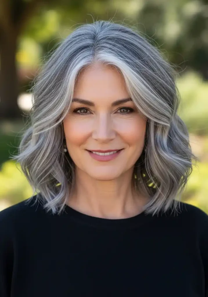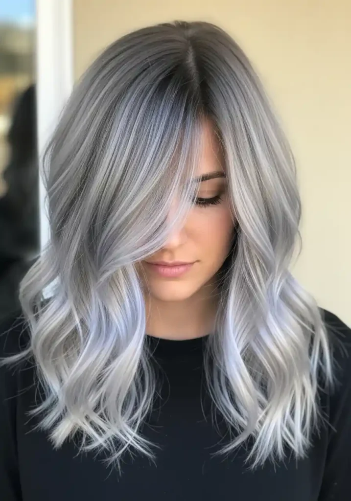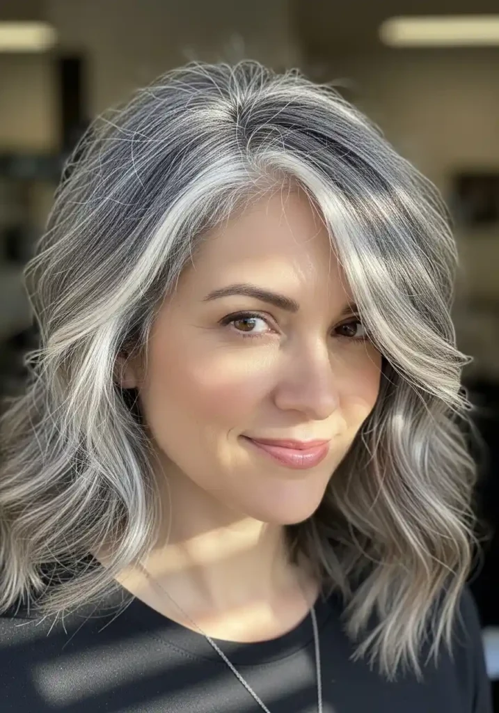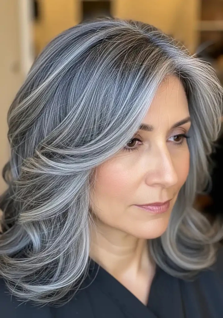 Silver highlights used as a gray blending technique represent one of the most proactively beautiful approaches to gray integration available, using deliberately placed metallic silver tones applied to pre-lightened sections of hair to create a bright, luminous highlight pattern that incorporates and celebrates the metallic quality of natural gray in the most visually spectacular way possible. Rather than simply tolerating the incoming silver, this technique actively amplifies it, adding more silver highlights that match and enhance the natural gray until the overall impression shifts from sparse gray growth to deliberately beautiful silver-dimensional color.