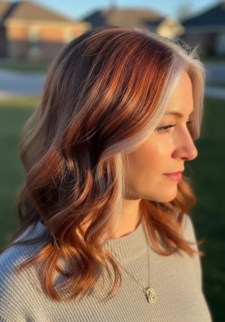 The natural progression of red hair toward gray as pigmentation naturally decreases over time creates some of the most uniquely beautiful and most individually distinctive hair color patterns available, as red and gray are tonal opposites that create a striking, jewel-like contrast when blended with skill and intention. Some colorists approach this with strawberry blonde highlights that soften the contrast by introducing a lighter, less saturated red tone into the composition, while others prefer a direct approach that simply enhances and celebrates the contrast between the warm red and cool silver as the defining aesthetic of the blended color. Both approaches produce spectacular and highly personal results that are impossible to fully replicate on non-red bases.