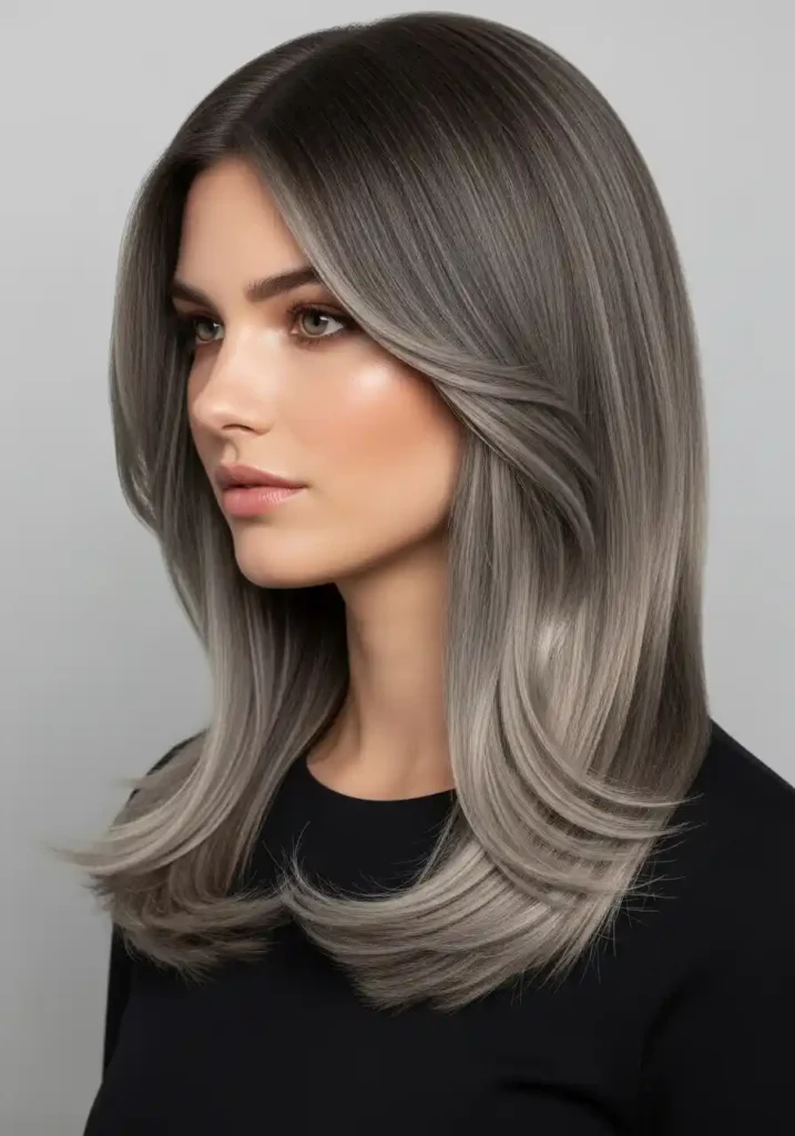 The smoky quality of this root blend performs a particularly effective visual function in relation to the face, as the cool, muted gray-brown tone at the root creates a softening, flattering transition between the hairline and the complexion that prevents any starkness or contrast from appearing at the most visible and most closely observed part of the hair. This softening effect is especially valuable for women who find that the abrupt transition between their natural gray root and their existing hair color creates an impression of harshness that they want to address without committing to a full color service every four weeks. A cool-toned toning shampoo used weekly at home maintains the smoky gray quality of the root blend between appointments.