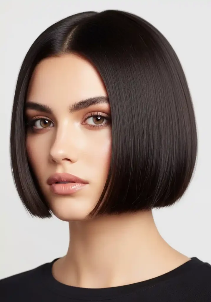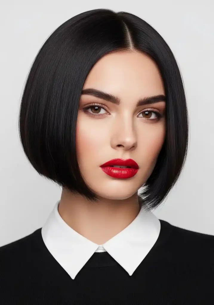 The eyebrow-level length of the French bob creates a very specific relationship with the oval face’s proportional structure — by ending the hair at the eyebrow level, the cut frames only the lower three-quarters of the oval face while leaving the forehead and upper face completely open. On an oval face, this reveals the forehead’s clean width and the face’s upper proportional balance without creating any concern about the face appearing too wide or too long, because the oval’s natural proportions are inherently ideal for this kind of bold exposure. Maintain with a salon visit every four weeks to preserve the clean blunt precision.