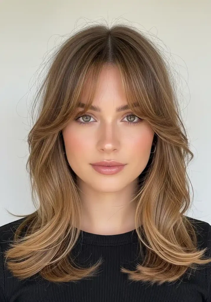 Wispy curtain bangs are perhaps the most naturally harmonious fringe style for oval faces because their specific characteristics — the gentle center part, the soft diagonal framing that sweeps toward the temples, the feathery light ends — complement and echo the oval face’s own qualities of balanced proportion, soft contouring, and harmonious symmetry. The curtain bang does not need to create any illusion or correction for the oval face because the oval face already has everything the curtain bang’s shape celebrates — it simply adds a beautiful, face-framing detail at the forehead that enhances the natural features with warmth and softness.