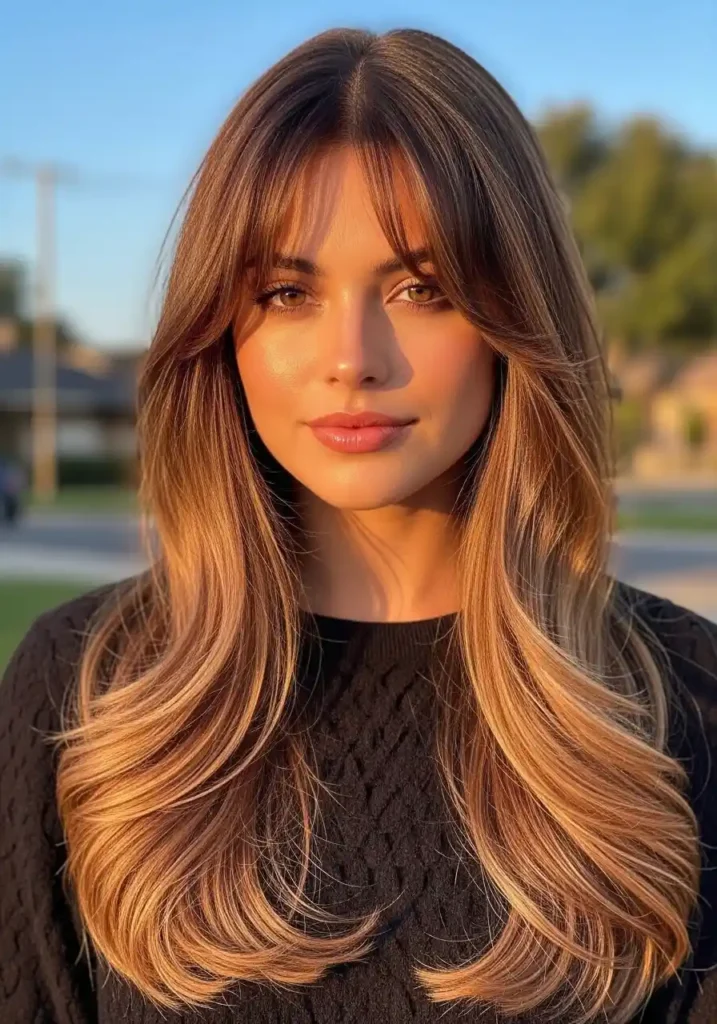Curtain bangs with long layers is the combination that flatters round faces most naturally and most effortlessly because every element is working in the direction of elongation simultaneously. The curtain bang’s center part creates a V-shape that points downward at the forehead, visually adding length to the upper face. The long layers below fall with vertical movement that extends the face’s perceived length toward the shoulders. The two elements together create a continuous vertical line from the top of the head to the ends of the hair that is the most effective possible antidote to a round face’s natural horizontal emphasis.