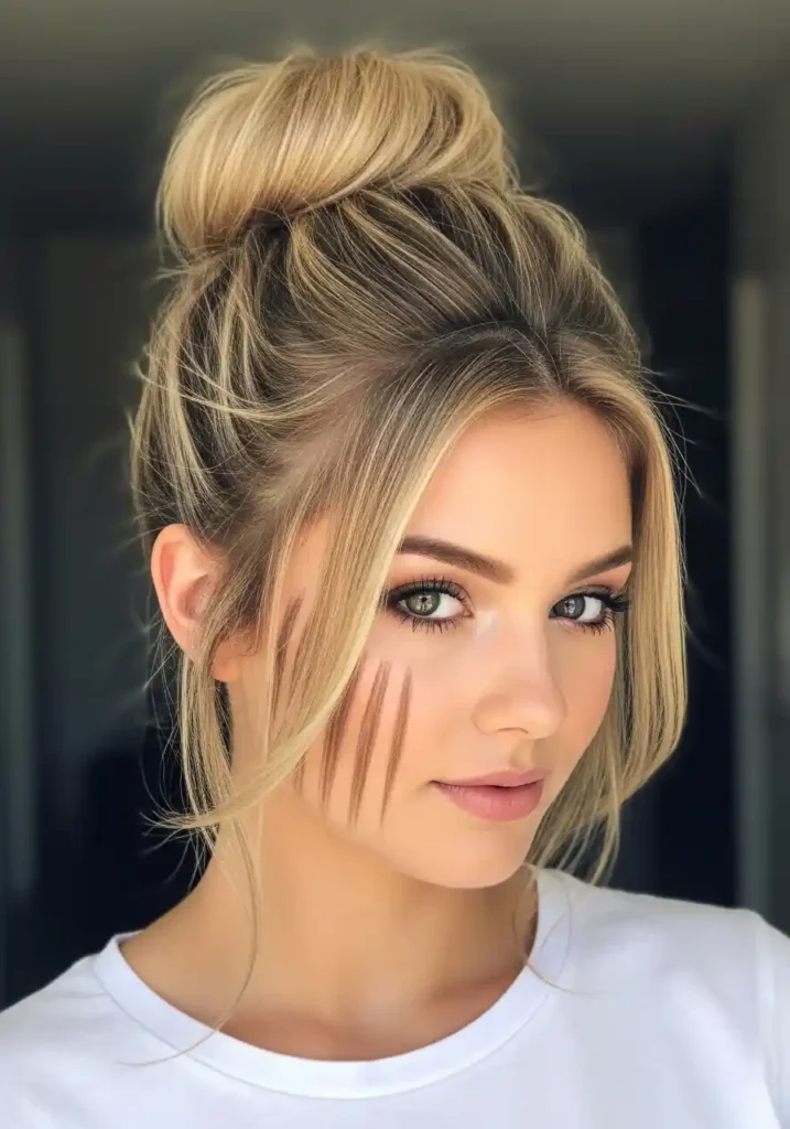 A high bun at the crown with wispy face-framing pieces is the updo version of the high ponytail’s elongating effect — the elevated position of the bun adds height above the head level that draws the eye upward and creates the impression of a significantly longer face, while the wispy face-framing pieces left free alongside the face provide the softening and slimming element that prevents the completely pulled-back style from looking too stark. The two elements work together to create an updo that is simultaneously elegant, flattering, and genuinely practical for a wide range of occasions.