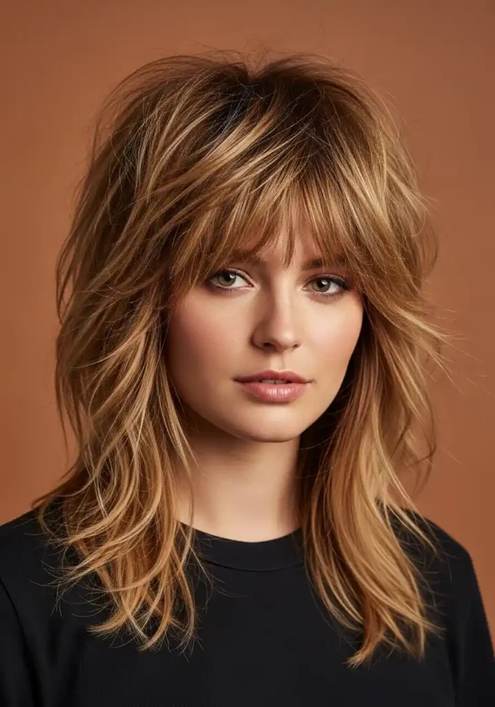 A long shag with face-framing layers is an extraordinarily flattering choice for round faces because the shag’s architectural characteristics — significant crown height from short top layers, face-framing layers that fall alongside the cheeks, and long wispy lengths at the perimeter — create the exact combination of height at the top and vertical extension at the bottom that elongates a round face most effectively. The crown layers build upward rather than outward, adding the height that a round face needs. The face-framing layers create a slimming vertical line alongside the cheeks. The long lengths extend the visual face downward.