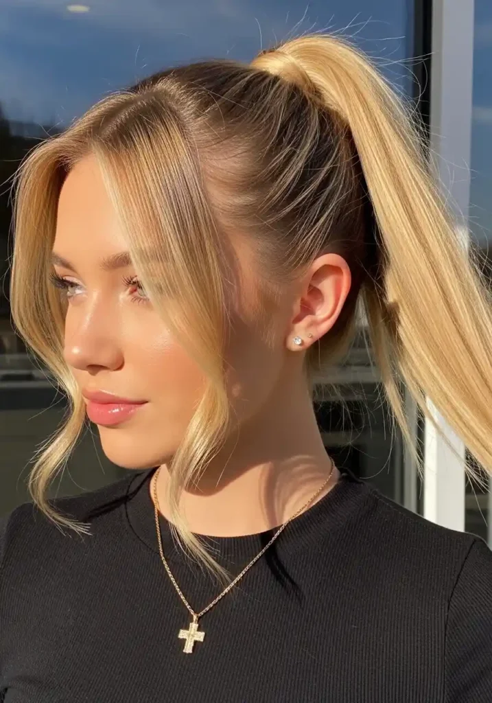A honey blonde ponytail is one of those apparently simple hairstyles that reveals itself to be significantly more beautiful and impactful than its minimal construction might suggest, because the warmth and richness of the honey golden tones transform the gathered tail into something that catches and holds light with a luminosity that makes the style appear far more glamorous and polished than a ponytail in a cooler or flatter color would achieve with identical construction and effort. The honey blonde appears to concentrate at the tail with a warm, glowing density that makes the ponytail itself look like a beautiful, deliberate style statement rather than simply a practical gathering of the hair.