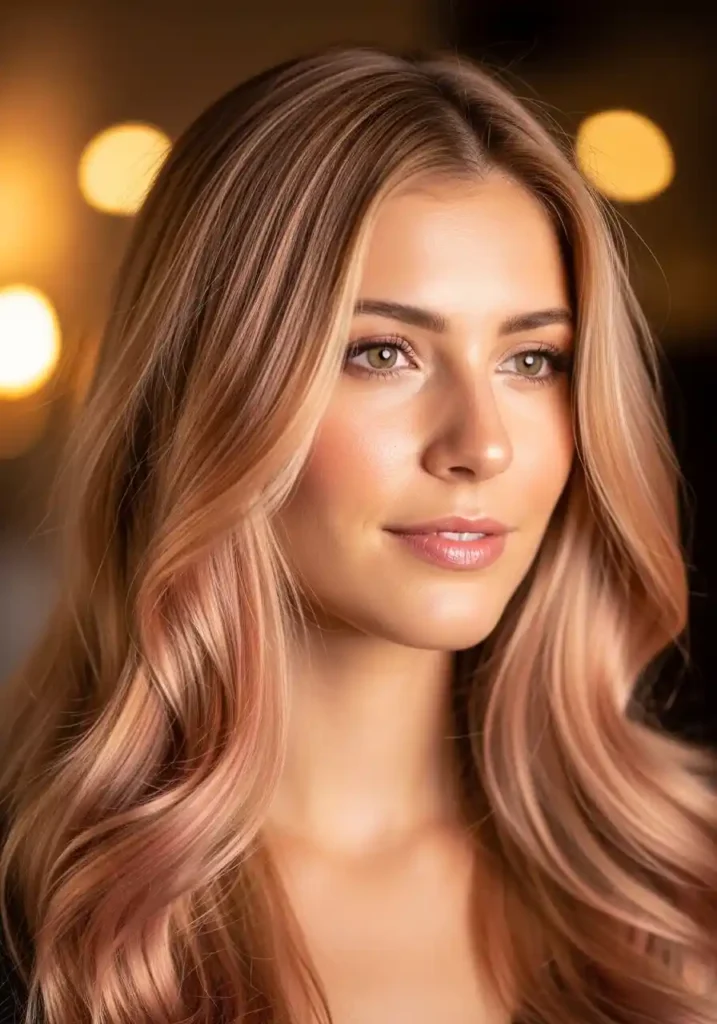 This combination is particularly beautiful for women with fair to medium skin tones with warm or neutral undertones because the honey golden warmth of the base color and the peachy-pink of the rose gold tones together create a color palette that resonates in the most deeply harmonious and flattering way with the natural warmth present in their complexion. The overall impression is of hair that has been simultaneously kissed by summer sun and the most delicate, warm pink light of a beautiful morning sky, creating a color of such gentle, multidimensional warmth and luminosity that it photographs with an almost otherworldly beauty regardless of the lighting conditions or photographic setting.
