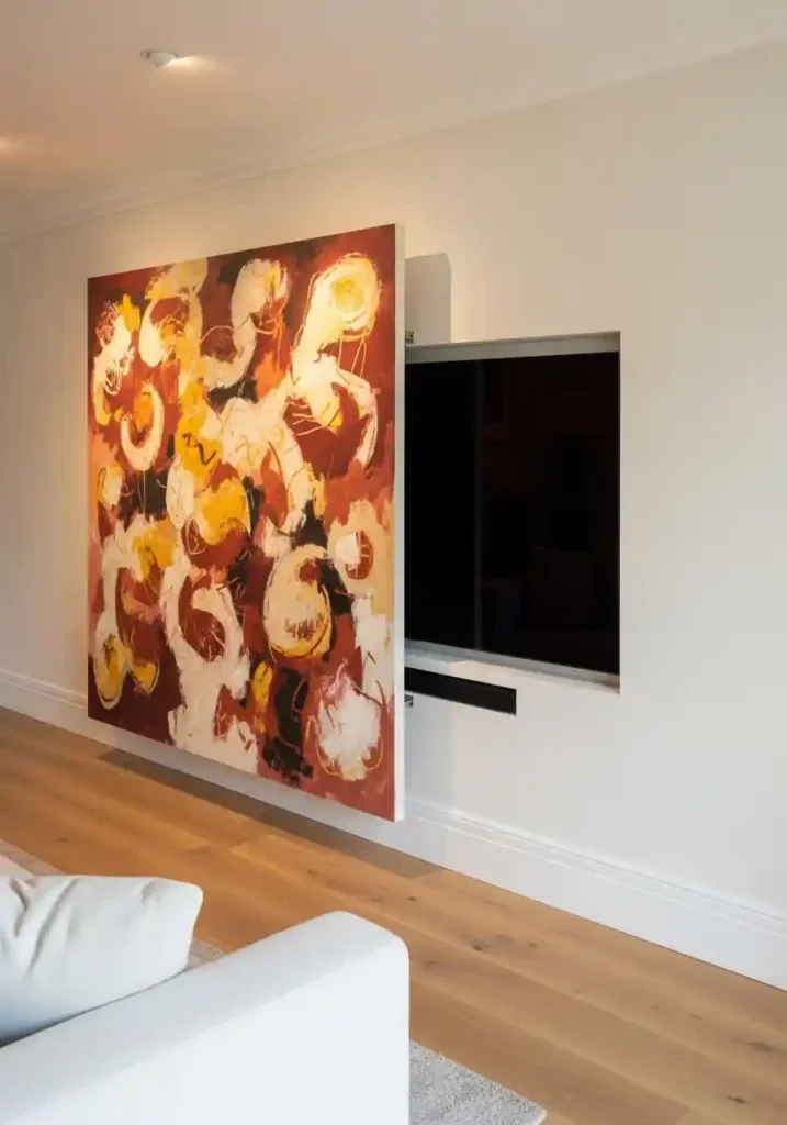 The most magnificently beautiful bespoke art and technology TV wall living rooms are those where the hinged artwork panel is of genuinely excellent quality — a significant commissioned abstract expressionist painting in warm terracotta, gold, and cream as a genuine work of personal artistic meaning. The artwork hinges mechanism smooth, silent, and invisible in both open and closed positions. OLED television flush within the wall behind the artwork panel. Warm gallery lighting illuminating the artwork when closed. Warm wide plank oak floors. Cream sofa. The bespoke art and technology TV wall creates the most personal and the most completely magnificent living room sleek style imaginable.