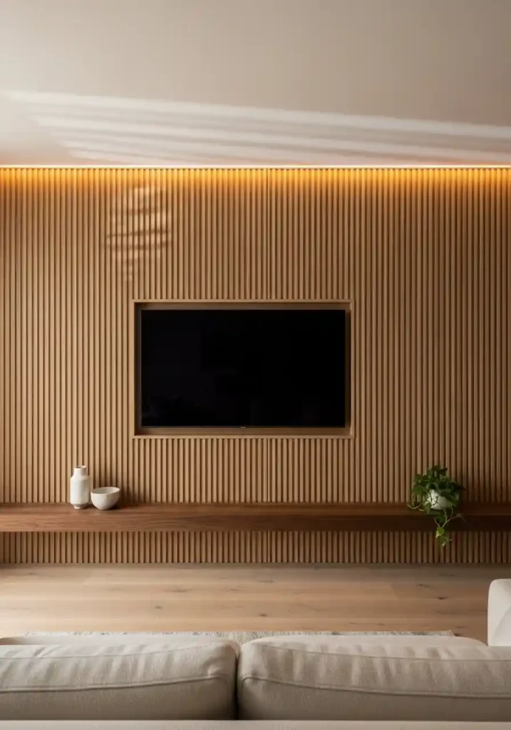 1. The Full-Height Fluted Wood Panel TV Wall: Texture, Drama, and Complete Architectural Resolution