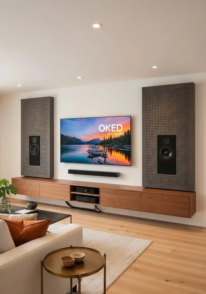 A living room TV wall designed with genuine acoustic excellence integrated within a beautiful visual composition — where premium in-wall speakers are concealed flush behind perforated acoustic panels in matching millwork finish, a high-quality sound bar of exceptional design quality provides the horizontal acoustic foundation, and a large format OLED television completes the composition above — creates the most technically complete and the most visually resolved home cinema television wall available, because genuinely excellent audio integrated invisibly within a beautifully designed wall composition creates an entertainment experience of extraordinary quality that separate, stand-alone speakers can rarely approach with the same visual elegance!