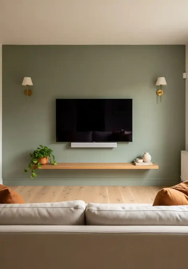The most magnificently beautiful sage green plaster TV wall living rooms are those where the specific sage chosen is genuinely warm and genuinely botanical — slightly yellow-warm sage creating maximum organic warmth. A slim profile television mount. Warm brass wall sconces flanking at matching height. A slim floating oak shelf below with a terracotta herb pot and simple ceramic. Warm blonde oak floors creating beautiful organic material harmony with the sage green. Cream linen sofa. Warm natural afternoon light. Each element creates a sage green TV wall of extraordinary botanical living room sleek style and genuine organic warmth.
