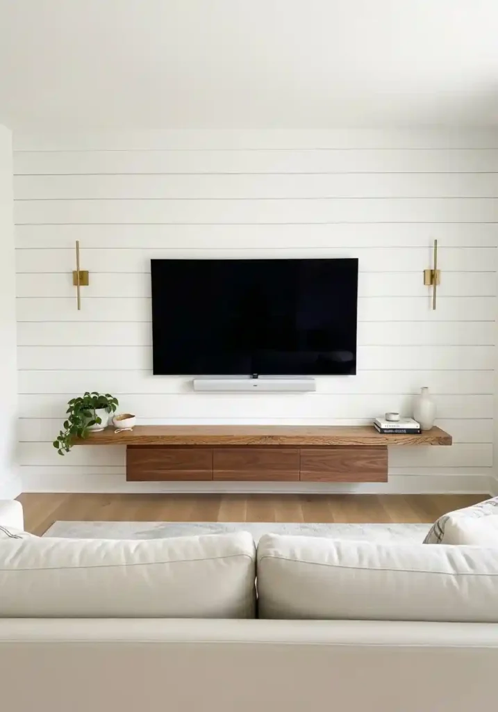 The most magnificently beautiful shiplap TV wall living rooms are those where the television mount is a genuinely slim profile that allows the screen to sit as close to the shiplap surface as possible — maximum visual integration with the textured wall behind. Floating reclaimed oak shelf below at the precise height. Slim brass wall sconces flanking the television creating warm flanking illumination. A low-profile walnut media console below. Fresh herb plants and simple ceramic objects on the floating shelf. Cream linen sofa opposite. Warm wide plank oak floors. The shiplap TV wall creates a warmly resolved modern farmhouse sleek style.