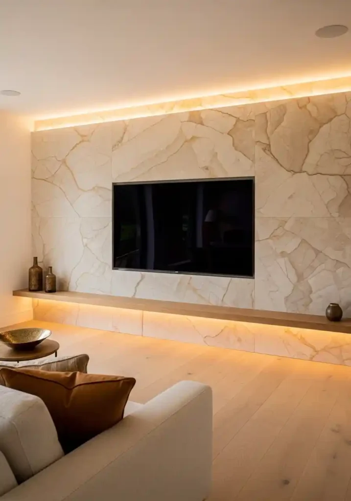 2. The Marble Feature Wall Television: Geological Luxury as the Perfect Screen Backdrop