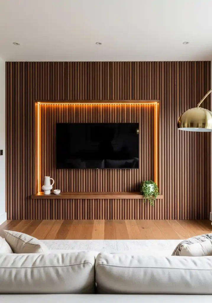 6. The Walnut Wood Slat TV Wall: The Most Warmly Textured Modern Solution