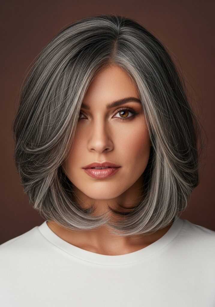 A lob with deliberate natural gray blending creates one of the most powerfully elegant and most specifically sophisticated long bob expressions available — the silver and gray tones of naturally aging hair create a shimmer and luminosity within the lob’s clean shape that colored hair cannot replicate, with each silver strand catching light with a metallic, almost iridescent quality that creates a dimensional beauty unique to genuine natural silver. The lob’s clean collarbone-length perimeter frames the silver-blended color with architectural elegance.