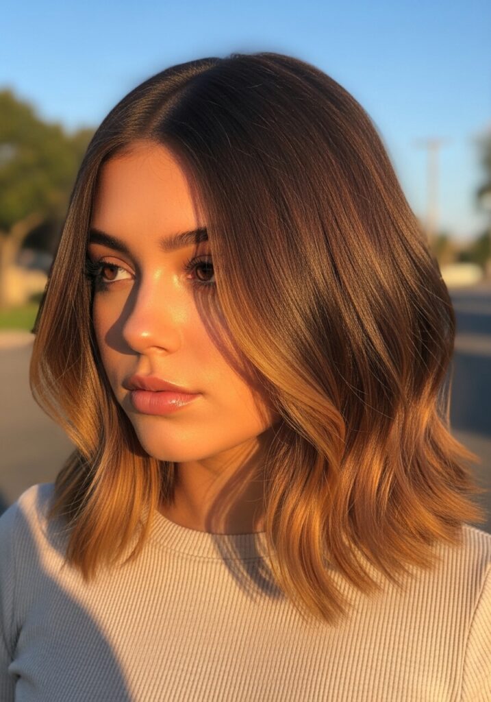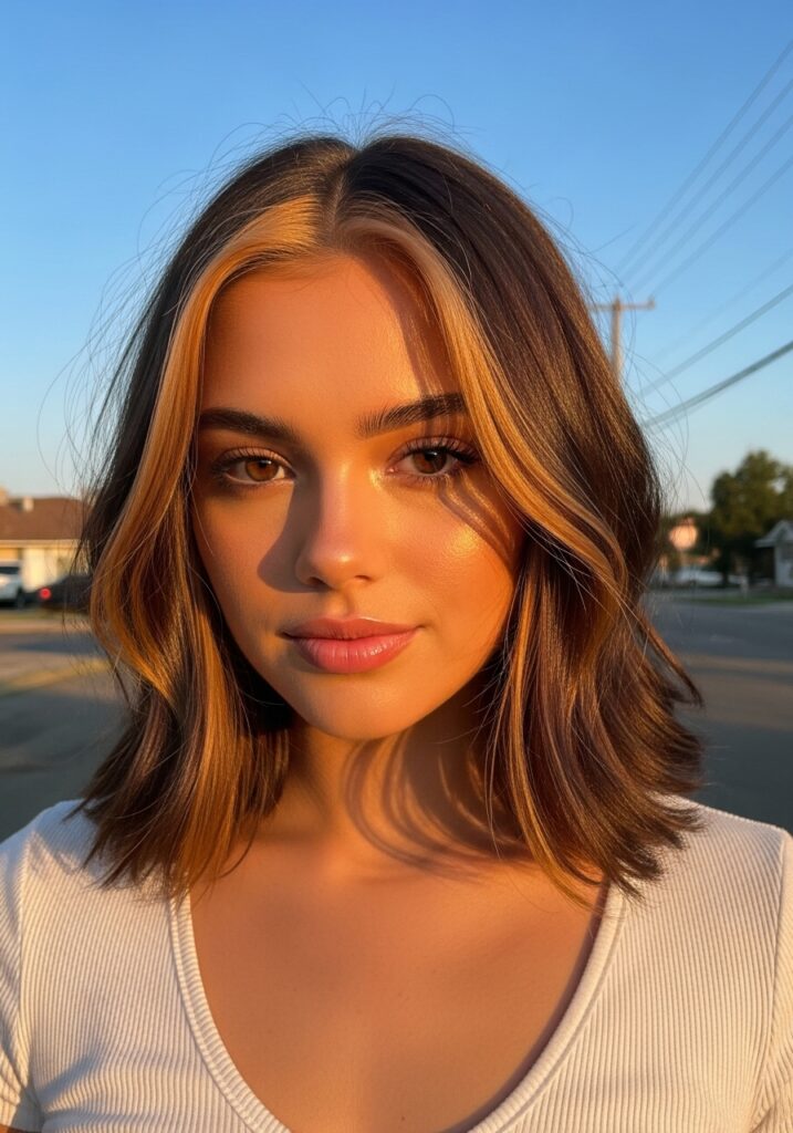 A lob with warm face-framing highlights creates the most targeted and most face-specifically flattering color-and-cut combination available in the long bob family — the warm highlighted sections in the lob’s front face-framing zones create an immediate luminosity around the features that makes the complexion appear more radiant and the eyes more vivid, while the lob’s clean collarbone-length perimeter provides the architectural framework within which the face-framing highlights perform most beautifully. The warmth of the highlights and the cleanliness of the lob create a specific synergy of color and cut.