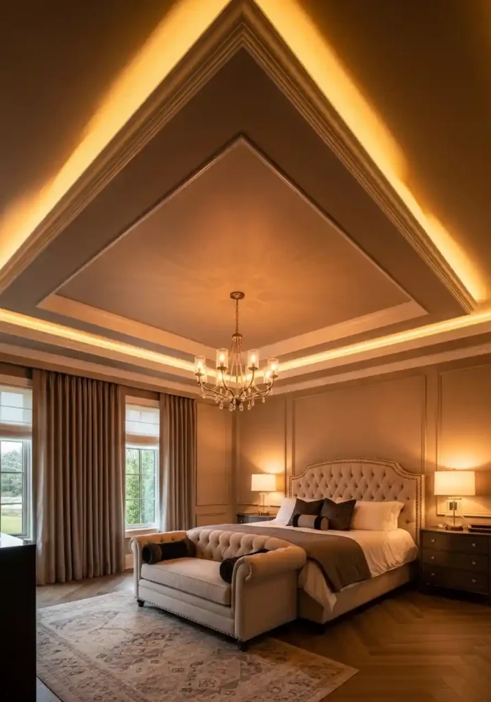 A tray ceiling with warm LED cove lighting creates the single most immediately beautiful and the most completely atmospheric ceiling treatment available for a master bedroom — the continuous warm amber glow emanating from within the tray perimeter creating an extraordinary floating ceiling effect of genuine architectural sophistication! The ceiling within the tray painted in a slightly deeper warm tone than the surrounding walls creates beautiful visual depth. A magnificent statement chandelier descending from the tray center above the bed provides the most dramatically beautiful and the most classically magnificent overhead focal point. All ceiling lighting on generous dimmer circuits for complete atmospheric control.