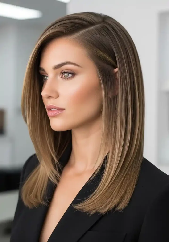 The hidden layers create lift at roots without visible graduation at the perimeter, making this appear more polished than overtly layered cuts while still providing volume benefits. This technique works exceptionally well for thick hair that becomes overwhelming without some weight removal, though it also benefits fine hair through the volume creation the internal layering provides. Styling can go sleek and straight to showcase the clean lines or wavy to reveal the hidden layers’ movement-creating properties. The blunt perimeter needs maintenance every 8-10 weeks to keep lines sharp, while the internal layers can extend slightly longer between refreshing appointments.