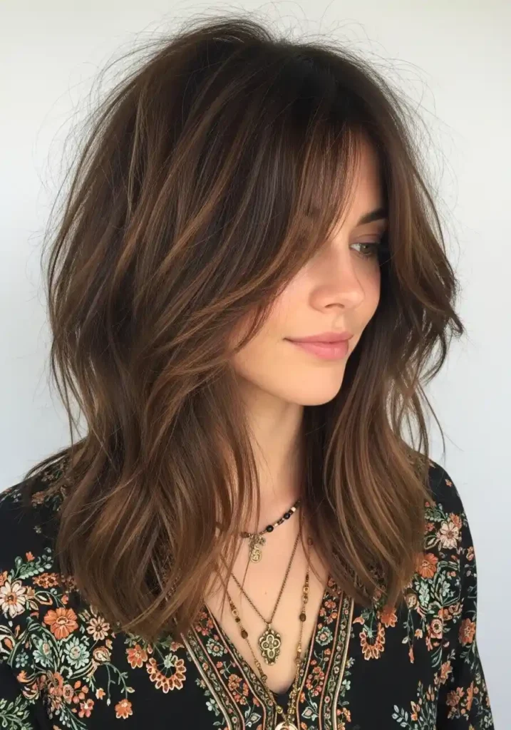 Shaggy layers create that coveted 70s-inspired texture through heavy layering from crown to ends, producing incredible movement and dimension throughout. The addition of curtain bangs—longer face-framing pieces that part in the center—adds softness around the face while maintaining the shag’s characteristic choppy texture. This combination creates effortlessly cool aesthetic that works across age groups despite its association with younger demographics. The heavy layering prevents any section from appearing too heavy or dragging down, instead creating dynamic flow and bounce that moves beautifully whether you’re walking, dancing, or simply turning your head.