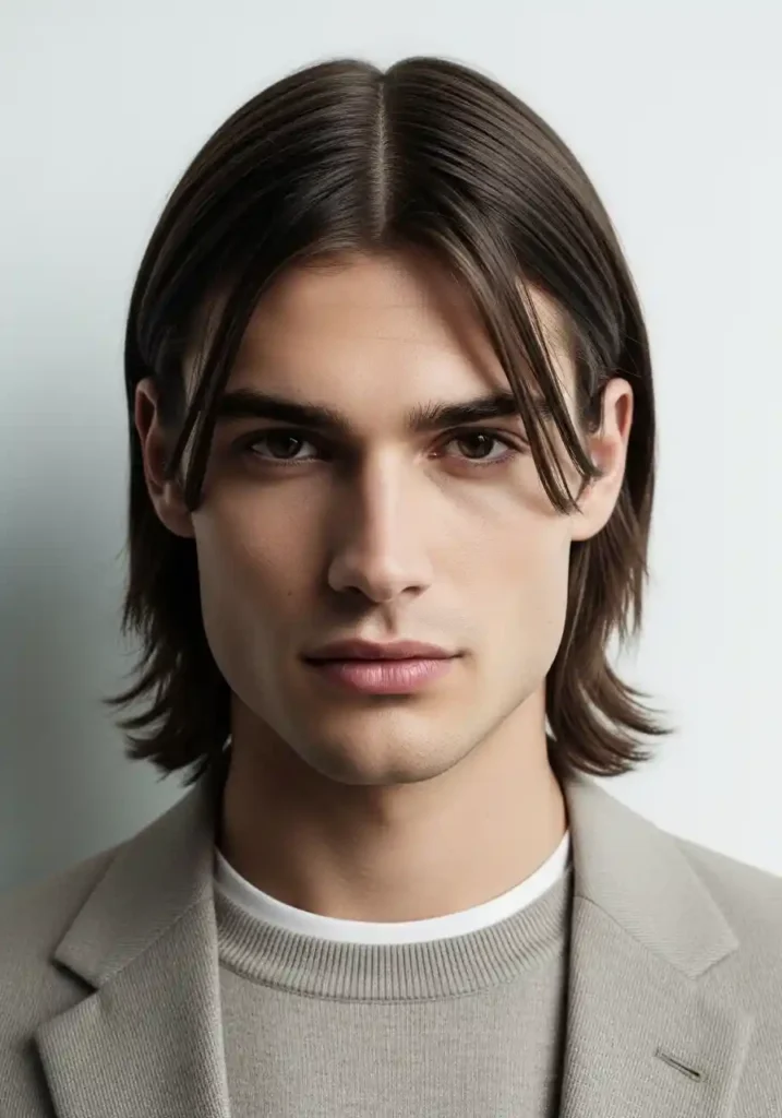 The middle part wolf cut in Korean styling combines the volumetric drama and textured layering of the wolf cut with the specific center-parted, face-framing sensibility of Korean men’s hair aesthetics to create a look that feels simultaneously bold and romantically soft, edgy and thoroughly appealing in a way that clearly communicates an awareness of the most current and most internationally influential directions in men’s grooming. The center part divides the layers into a symmetrical, face-framing arrangement that adds a Korean romantic quality to the wolf cut’s inherently more expressive structure.