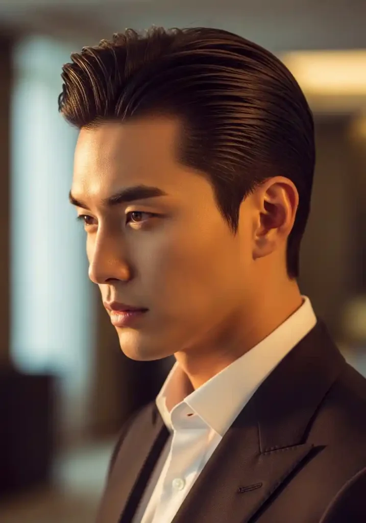 The slicked back Korean style applies the clean, glossy aesthetic philosophy of Korean men’s grooming to a sleek, back-swept styling approach that creates a sophisticated, polished look of genuine masculine elegance that suits formal and professional settings with equal ease and equal impact. The Korean interpretation of the slick back prioritizes natural-looking gloss and smooth texture over the heavy, product-saturated quality of a traditional Western slick back, using a light to medium hold product that creates a sleek, refined surface without the stiff, lacquered appearance that overly heavy products create.