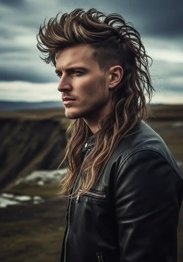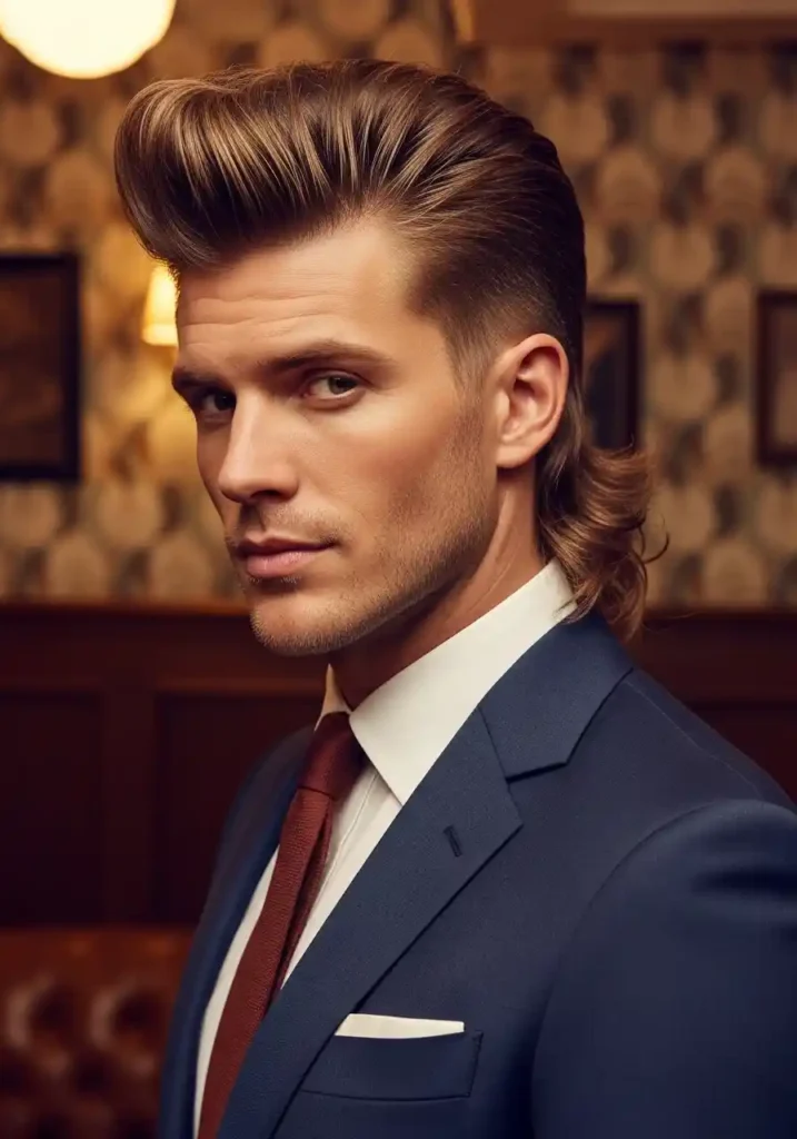 The retro quality of the pompadour mullet references multiple great eras in men’s hair history, from the original rock-and-roll pompadours of the 1950s through the theatrical excess of 1980s rock styling, giving the combined cut a genuine historical depth and a specific cultural richness that more purely contemporary mullet interpretations lack. Men who wear the pompadour mullet tend to have a genuine appreciation for the history of men’s style and a deliberate desire to engage with that history through their own personal grooming choices, creating a result that feels thoughtful and culturally aware rather than simply stylistically adventurous. A strong-hold pomade creates the ideal finish for the pompadour section, while a lighter product maintains the natural movement of the longer back.