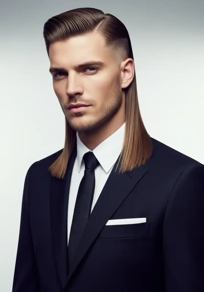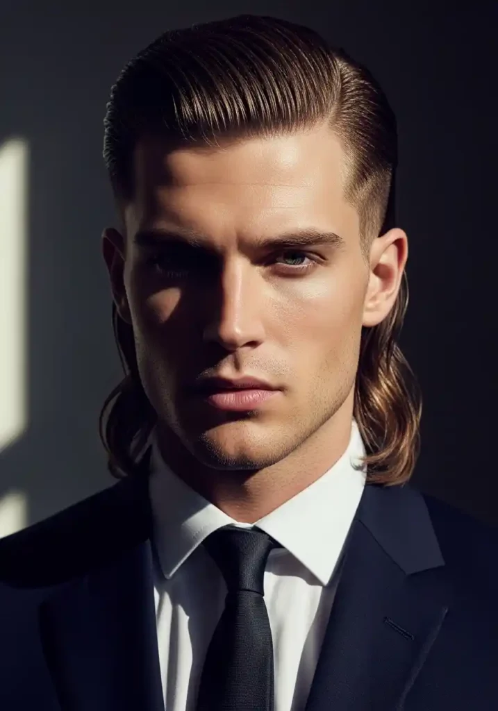 The slick back mullet creates one of the most powerfully masculine and most deliberately sophisticated interpretations of the mullet concept, using a smoothly styled, slicked-back front and top section to create a polished, controlled aesthetic at the upper part of the head that contrasts dramatically with the longer, more freely falling back section in a way that produces an overall impression of confident, intentional style that reads as genuinely sophisticated rather than simply unconventional. The slick-back front brings a high-fashion quality to the mullet structure.