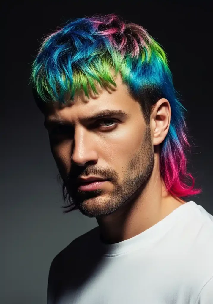 The specific placement of bold color within a mullet provides interesting design possibilities that more conventional men’s haircuts cannot accommodate with the same creative logic, as the natural contrast between the shorter sides and the longer back creates a built-in color placement opportunity where the vivid color can be confined to the longer back section for maximum reveal quality, applied throughout the entire cut for maximum saturation, or graduated from the shorter to the longer sections in a way that interacts with the mullet’s natural length contrast to create a dynamic color-and-length combination that appears genuinely thought through and genuinely artistically conceived. A color-protecting shampoo and UV protection spray maintain the vibrancy of vivid colors between professional touch-up appointments.