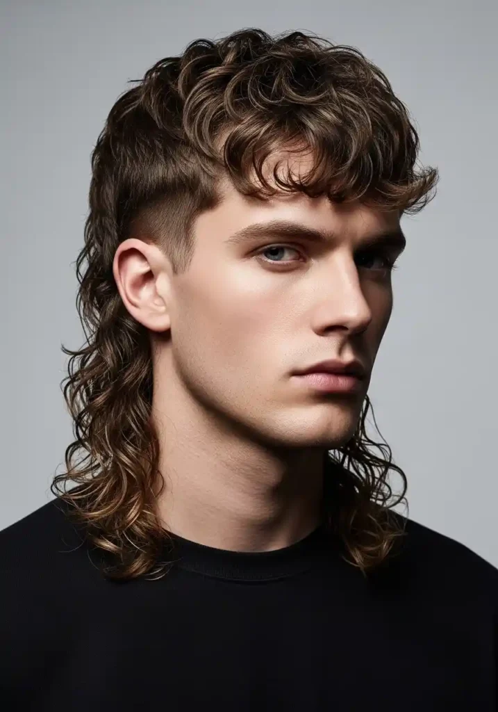The textured mullet with curtain fringe creates one of the most thoroughly contemporary and most naturally stylish interpretations of the mullet concept, combining the face-framing softness of a center-parted curtain fringe at the front with the length contrast of the mullet at the back and a deliberately textured quality throughout that gives the entire haircut an organic, effortlessly cool personality that photographs magnificently and sits perfectly within the broader men’s grooming aesthetic of 2025. The curtain fringe adds a romantic, slightly vintage quality that elevates the overall impression beyond the purely edgy.