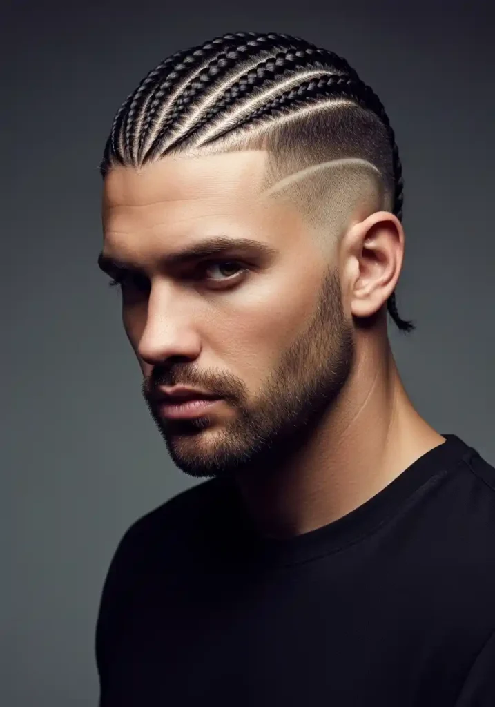 The specific pattern of the cornrows within the undercut context creates a top section of remarkable visual detail and genuine artistic composition, with the lines of the braids running in deliberate directions through the hair in a pattern that can range from simple, parallel rows to more complex geometric or curved arrangements that make the top section a genuinely impressive feat of hair artistry. The clean undercut sides provide a perfect contrasting frame for the intricate braid pattern above, with the precision of the closely cropped or faded sides making the detail of the braided pattern appear even more elaborate and more carefully crafted by comparison with the clean simplicity of the surrounding shaved sections. Regular re-braiding maintains the fresh, precise quality of the cornrow pattern.