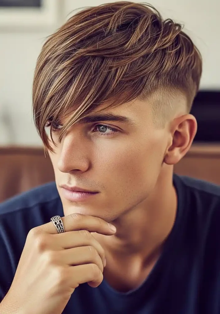 The undercut with a fringe creates one of the most romantically beautiful and most face-framing undercut variations available, using longer front sections of the top that are styled to fall forward over the forehead in a soft, face-framing fringe arrangement that adds a specific, intimate warmth and romantic attractiveness to the bold undercut structure that completely contrasts with and beautifully complements the clean, sharp quality of the closely cropped undercut sides. The fringe creates an immediate softening effect at the front that makes the boldness of the sides feel balanced and complete.