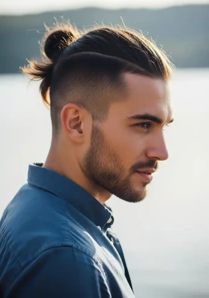 When the long top section is gathered into a top knot above the shaved undercut sides, the clean, closely cropped sides become completely and dramatically visible in a way that makes the overall look most clearly and most powerfully read as an intentional, architectural haircut concept rather than simply long hair with shorter sides. The contrast between the gathered, rounded top knot and the clean, precision-cropped undercut sides creates the most graphically bold and most visually striking version of this versatile look, communicating a bold, expressive personal style identity that is genuinely cool and genuinely distinctive in any setting. Regular care of the long top section maintains the health and quality that make the top knot most beautiful and most impressively full when gathered.