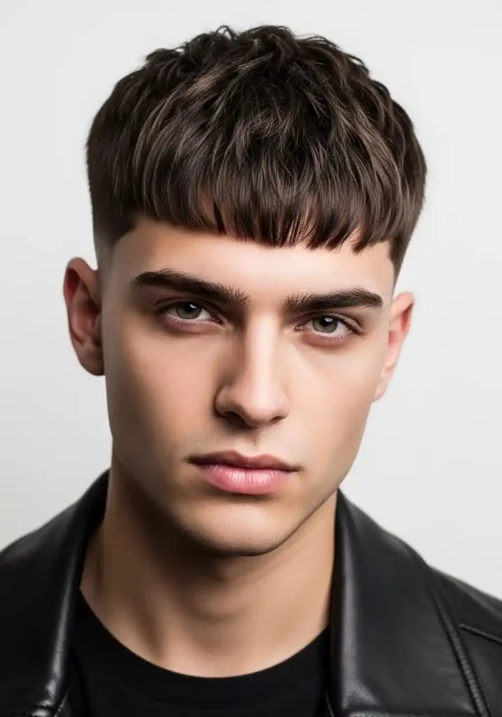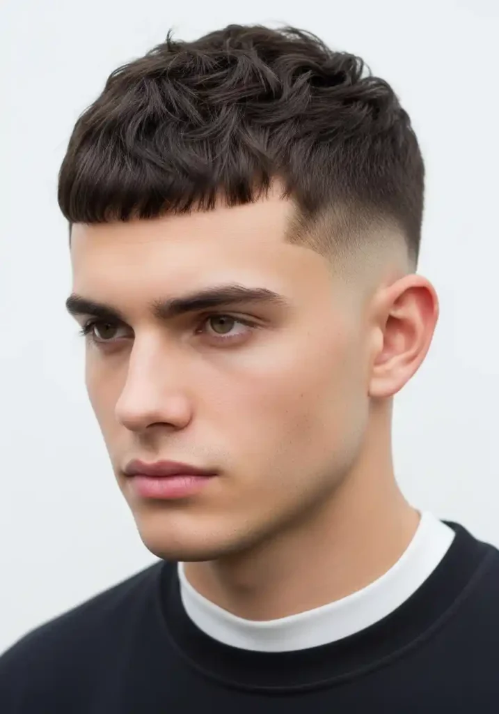 The French crop with a textured fringe creates one of the most specifically contemporary and most distinctively styled modern men’s haircut expressions — the characteristic horizontal fringe element of the crop creates a cool, deliberate face-framing statement that distinguishes this cut from conventional short cuts while the textured quality of the fringe adds the organic, natural character that prevents the crop from appearing overly formal or overly structured. The French crop is specifically and completely modern in its design philosophy.