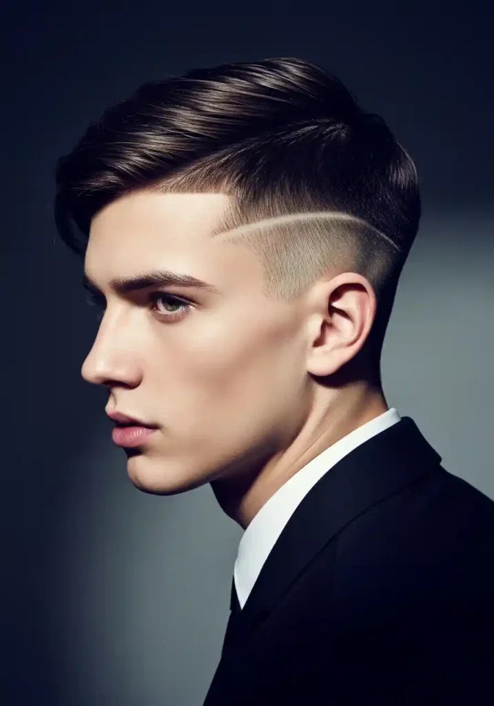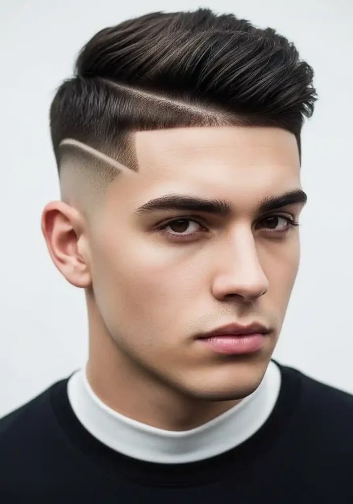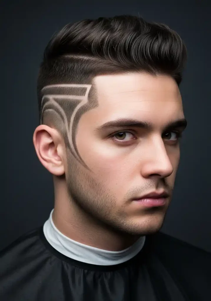 A skin fade with a deliberate shaved design element — a geometric pattern, a precise curved line, or a specific organic form created with a straight razor within the fade — creates the most creatively expressive and most specifically artistic men’s haircut statement available. The design communicates complete creative conviction and genuine individual character while existing within the clean, precisely groomed context of the skin fade’s characteristic quality. The combination is specific, artistic, and completely personal.