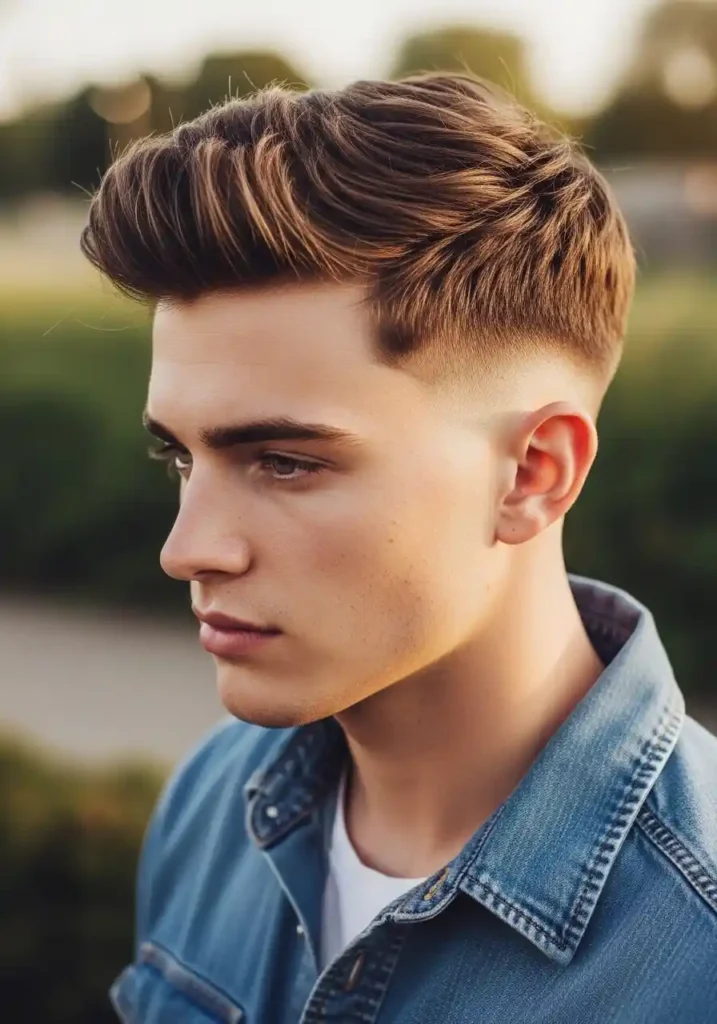The high fade requires the most precise and most technically demanding execution of any fade variation — the line where the skin fade begins must be consistently high and precisely defined on both sides for the structural boldness to read as completely intentional and completely resolved. A professional clean-up every two to three weeks preserves the high fade’s characteristic bold precision. Style the textured top with a matte clay worked through with the fingertips for the most natural personality expression within the bold structure.