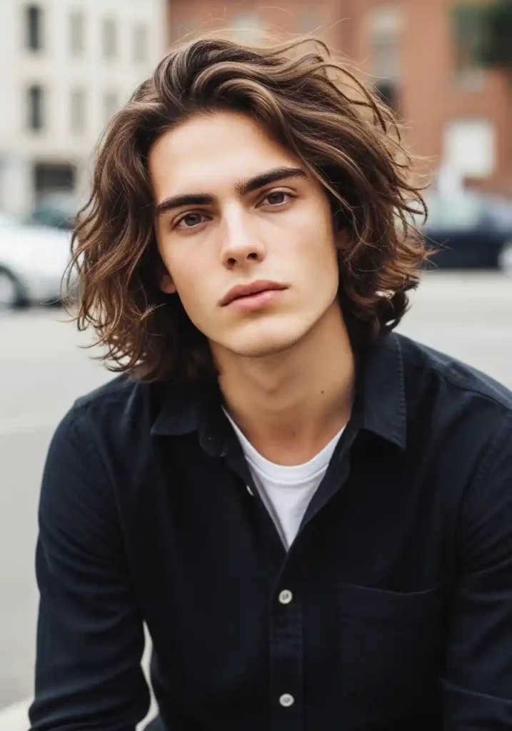 Long tousled men’s hair at shoulder length creates the most genuinely rock-inspired and most organically cool of all long men’s hairstyle expressions — the natural wave and organic tousled texture create a quality of effortless, unhurried coolness that communicates genuine aesthetic personality and genuine ease with the hair’s natural character. This is the hair of musicians, artists, and anyone whose relationship with their own appearance prioritizes genuine personal expression over conventional grooming standards.