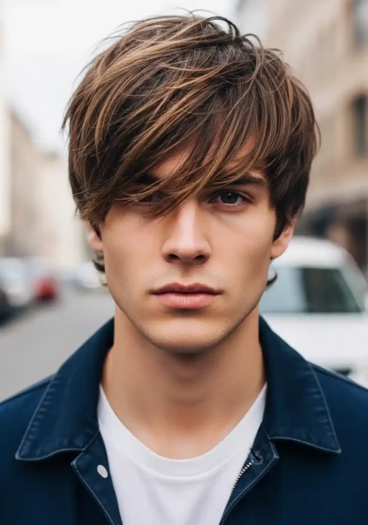 A longer messy fringe falling naturally across the forehead creates the most casually cool and most specifically effortless face-framing men’s hair element available — the natural, organic way a well-cut messy fringe falls across the forehead appears most specifically cool precisely when it appears least deliberately styled, creating a quality of casual, unstudied face-framing warmth that reads as genuinely natural rather than as a deliberately constructed hairstyle decision. This is effortless cool in its most authentic form.