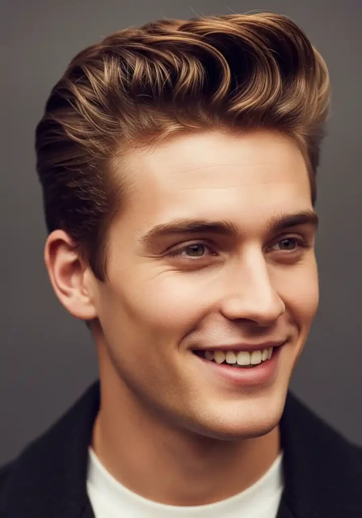 The natural wave within the medium pompadour is most beautifully expressed when the styling approach works with the wave’s natural movement direction rather than attempting to smooth the wave into a uniformly sleek pompadour surface — the wavy pompadour looks most specifically beautiful when the waves are visible within the upward sweep rather than hidden beneath a heavy product application. A medium hold flexible cream or light pomade applied to damp hair and directed upward with the fingers creates the most naturally charming wavy pompadour expression.