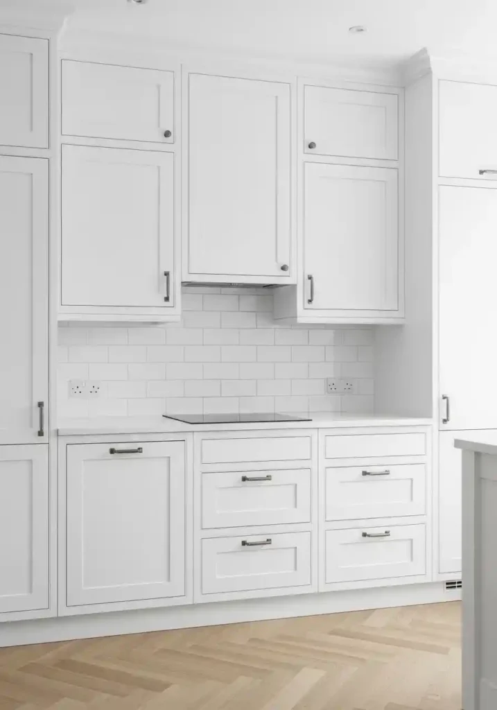 The most magnificently beautiful all-white handleless modern kitchen installations are those where the specific white tone is consistent across every surface and every material — all cabinets, countertop, backsplash, and appliance panels sharing the same warm white rather than different whites that create unfortunate visible mismatches at material junctions! Matte finish on all surfaces preventing reflective inconsistency. Warm blonde oak floor creating the essential and the only material contrast that grounds the all-white composition with organic warmth. Integrated J-pull profiles in consistent depth and dimension throughout. Seamless appliance integration. The all-white modern kitchen achieves absolute visual purity.
