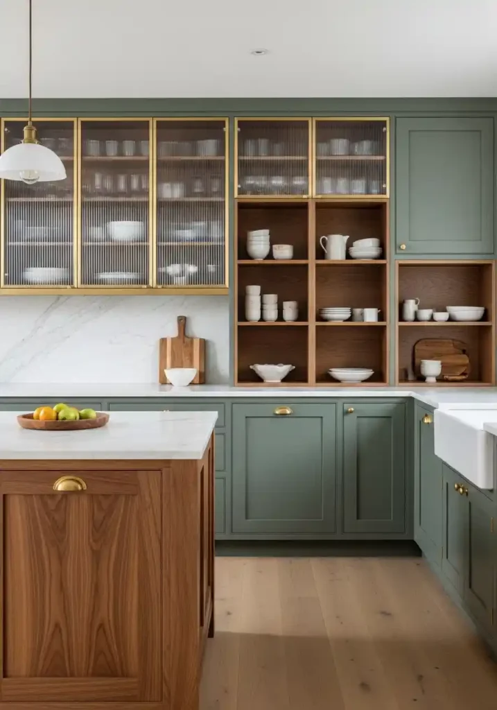 The most magnificently beautiful bespoke mixed material modern kitchen installations are those where every material choice is genuinely purposeful and genuinely integrated into a single, cohesive design vision — book-matched walnut veneer creating extraordinary geological timber beauty at the island. Ribbed glass creating beautifully textured display. Sage green flat panel creating warm botanical character on the perimeter. Each material chosen for its specific contribution to the complete kitchen composition. Warm brass hardware unifying every different material section. Warm marble countertop. Warm oak floor. The most personal and the most completely magnificent modern kitchen imaginable.