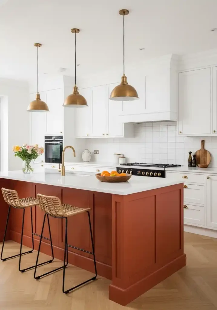 The most magnificently beautiful color pop island modern kitchen installations are those where the island color is genuinely bold and genuinely committed — warm terracotta creating the most earthy and the most organically warm island color pop. Deep navy creating the most classically dramatic and the most timeless result. Sage green creating the most botanically beautiful. Warm mustard yellow creating the most joyfully bold. The surrounding perimeter kitchen in pure flat panel white creating the most beautifully clean and the most completely uncompetitive context for the island’s bold color to perform at absolute maximum visual brilliance.